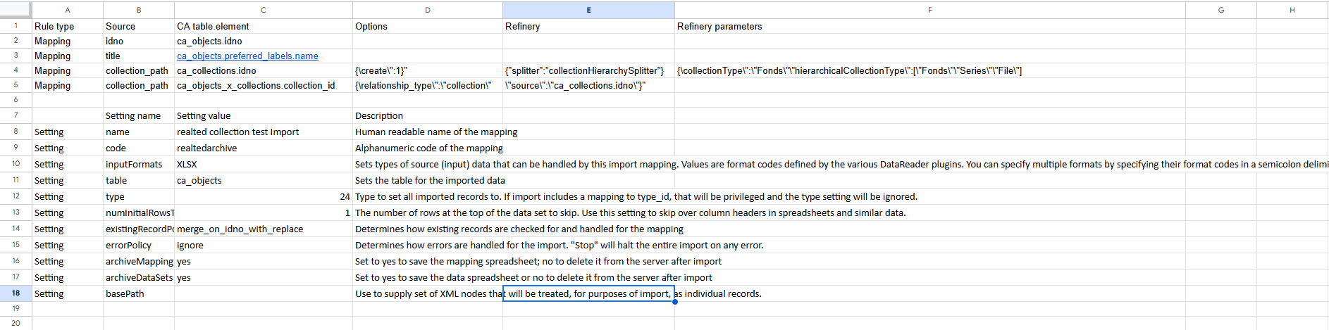 Although our mapping and spreadsheet appear correct, the hierarchy and object–collection relationships are not being created during import — the process finishes with “0 processed, 0 errors.”